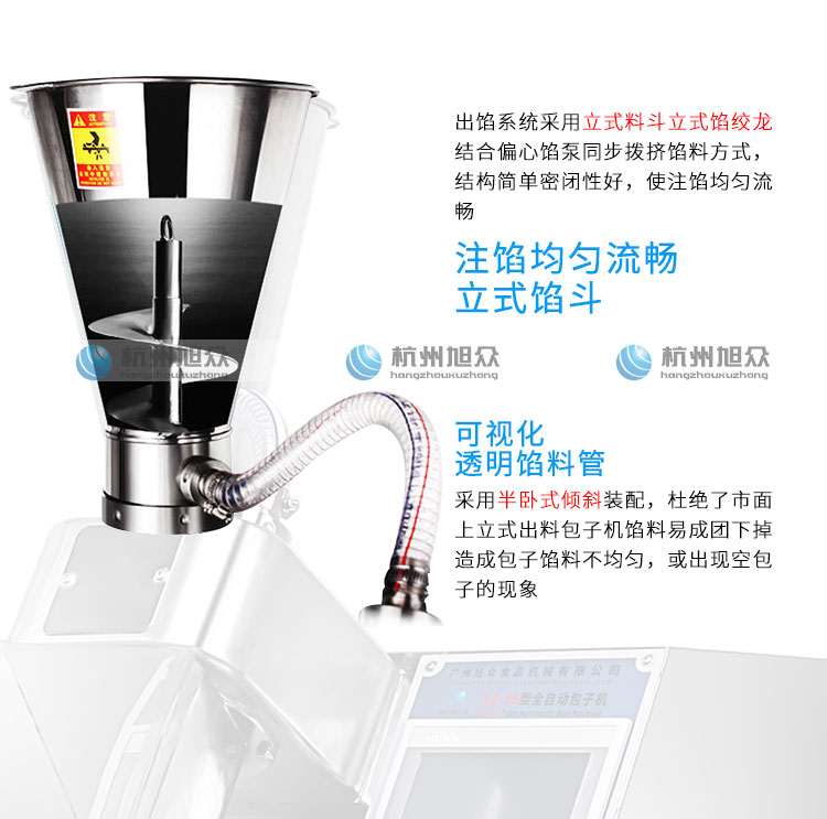 ◆出餡系統(tǒng):立式料斗,立式餡攪龍結(jié)合偏心餡泵同步撥擠餡料方式。結(jié)構(gòu)簡(jiǎn)單密閉性好。使注餡 均勻流暢,實(shí)用于決大多數(shù) 菜包,肉包,灌湯包,奶黃包,豆沙蓮蓉包 等餡料。并且餡管采用半臥式傾斜裝配,防止了市面上立式出料包子機(jī)餡料容易成團(tuán)下掉造成包子餡料不均勻或出現(xiàn)空包子的現(xiàn)象。