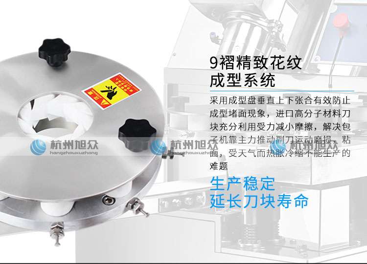 ◆包子成型系統(tǒng) :采用成型盤垂直上下移動(dòng),配合刀塊張合徹底防止以前包子機(jī)做大包子成型堵面的現(xiàn)象。9塊進(jìn)口高分子材料刀塊充分利用力學(xué)原理均衡受力減小摩擦,徹底解決了其它包子機(jī)成型刀塊靠一塊主刀推動(dòng)其它8塊副刀運(yùn)動(dòng)易磨損,刀夾面粘面,易受天氣變化而熱脹冷縮不能正常生產(chǎn)的的難題。生產(chǎn)穩(wěn)定大大延長(zhǎng)成型刀塊使用時(shí)間。